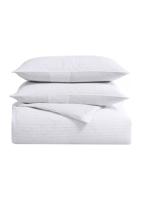 Transform your bedroom into a serene oasis with the Tommy Bahama basketweave duvet cover set. This duvet set features a unique and subtle basketweave woven design on a solid white ground. The reverse is a matching solid white ground on a cotton percale. The duvet is 100% cotton and features a button closer and four inner corner ties- used to keep your duvet insert in lace; duvet cover insert not included. Included shams features a two piece back closure for easy removal. Our products are crafted with you in mind, this duvet set is standard 100 by oeko-tex certification- tested against a list of 350 harmful substances, resulting in a chemical free item. The set includes 1 duvet cover and 2 shams. Ensemble is machine washable for easy care.