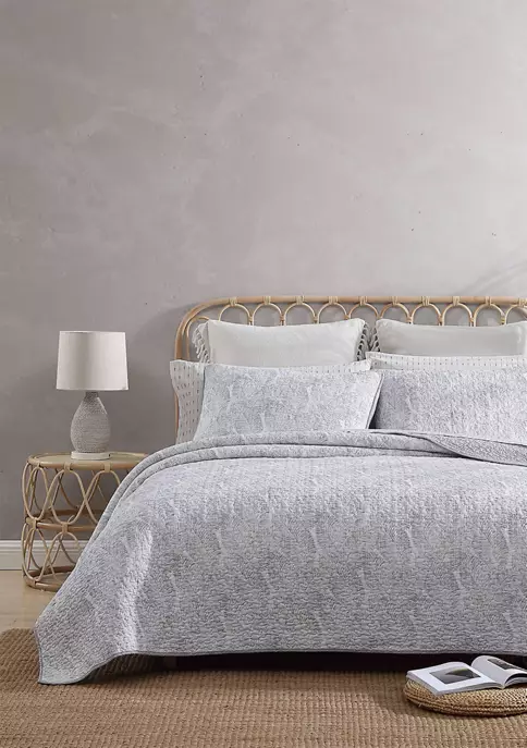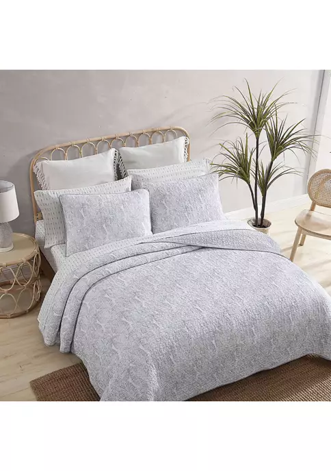 Our Tommy Bahama distressed water leaves quilt set features an allover printed blue fern design on a white ground. The reverse is a textured light blue. This quilt is 100% cotton, with a cotton (80%)/polyester (20%) filling, lightweight and easy to layer. The shams feature a two piece back closure. The corners of the quilt are rounded to match the sham, both edges are finished with a fabric binding. This quilt set is fully reversible. We have reduced our packaging footprint to be more sustainable. Your quilt set will arrive secured with a ribbon. The set includes 1 quilt and 2 shams (1 sham for the twin set). Machine washable, for easy care.