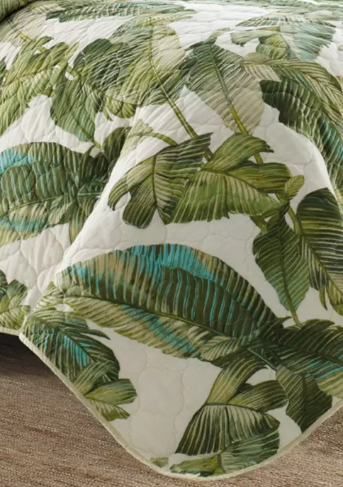 Our Tommy Bahama fiesta palms quilt features oversized green palm leaves on a white ground. The reverse is a soft yellow. This quilt is 100% cotton, with a cotton (80%)/polyester (20%) filling, lightweight and easy to layer. The shams feature a two piece back closure. The corners of the quilt are rounded to match the sham, both edges are finished with a fabric binding. This quilt set is fully reversible. We have reduced our packaging, eliminating all plastic. Your quilt set will arrive secured with a ribbon. The set includes 1 quilt and 2 shams (1 sham for the twin set). Machine washable, for easy care.