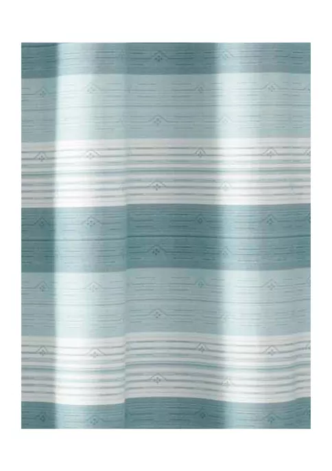Add some island tranquility to your bathroom with the Tommy Bahama® Hula Beach Cotton Shower Curtain. The design features a horizontal blue and white stripe design with delicate geometric detailing. 100% cotton and machine washable for easy care. Liner and hooks not included. Shower cotton is machine washable for easy care.