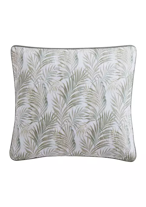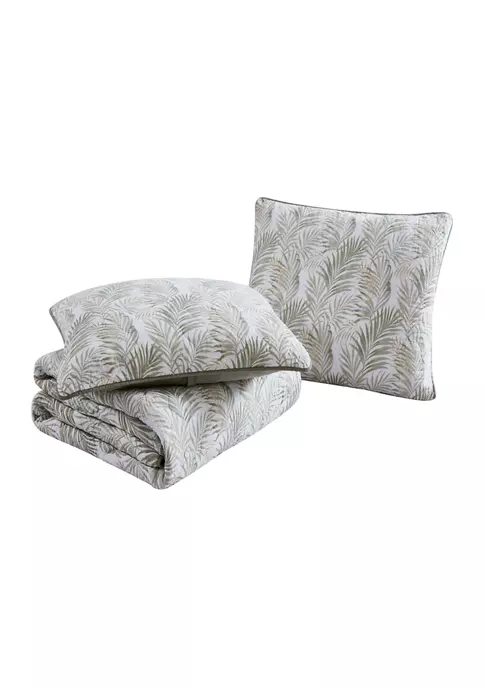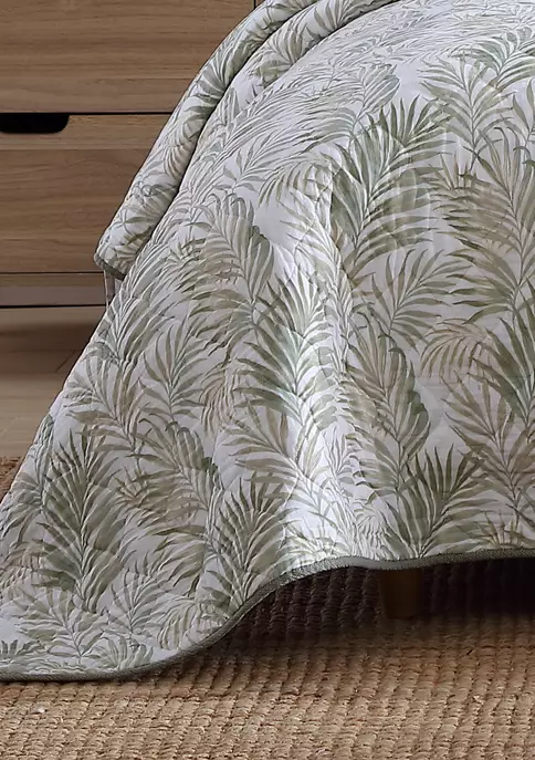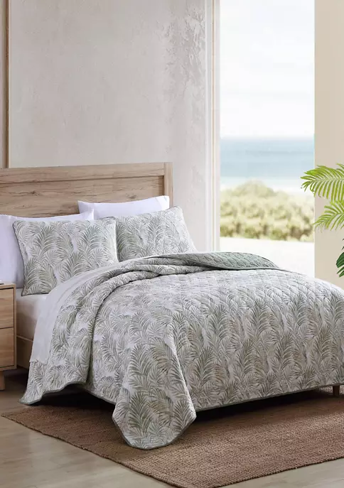 Our Tommy Bahama Maui Palm quilt features a printed sage palm leaf motif on a white ground; the reverse is sage; this quilt is 100% cotton, with a cotton (80%)/polyester (20%) filling, lightweight and easy to layer; the shams feature a two piece back closure; the corners of the quilt are rounded to match the sham, both edges are finished with a fabric binding; this quilt set is fully reversible; we have reduced our packaging, eliminating all plastic; your quilt set will arrive secured with a ribbon; the set includes 1 quilt and 2 shams (1 sham for the twin set); machine washable, for easy care. Twin set: Quilt- 88”L x 68”W, Standard Sham 21″L x 27”W; Full/queen set: Quilt- 90”L x 90”W, Standard Shams- 21”L x 27”W; King set: Quilt-96”L x 104”W, King Shams- 21”L x 37”W.