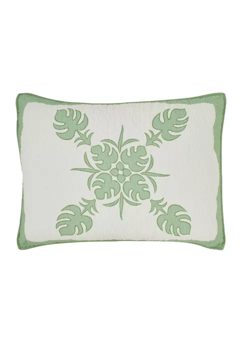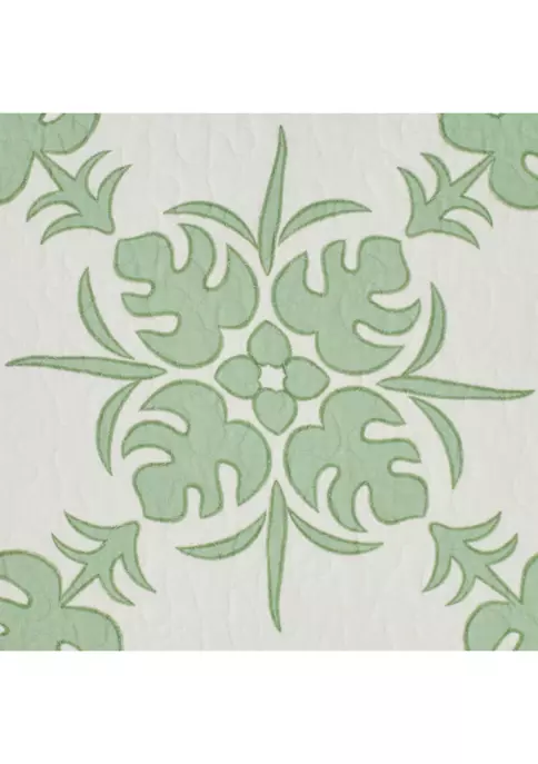 Our Tommy Bahama Molokai quilt was inspired by the tropical island in Hawaii. Our Tommy Bahama Molokai quilt features embroidered tropical motifs in a beautiful green color on a quilted ivory ground. The reverse is green. This quilt is 100% cotton, with a cotton (80%)/polyester (20%) filling, lightweight and easy to layer. The shams feature a two piece back closure. The corners of the quilt are rounded to match the sham, both edges are finished with a fabric binding. This quilt is fully reversible. We have reduced our packaging, eliminating all plastic. Your quilt set will arrive secured with a ribbon. Quilt and shams are sold separately. Machine washable, for easy care.