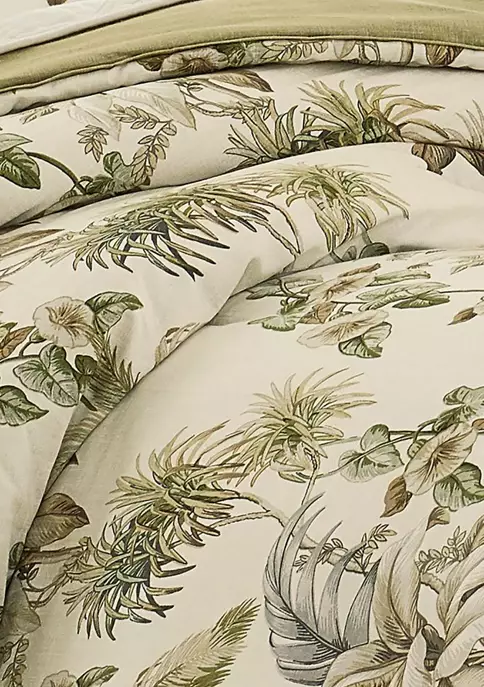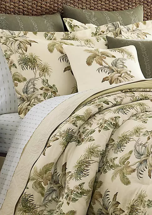Update your bedroom décor with the nador cotton comforter set from Tommy Bahama. Tropical island foliage and palm trees flow in a vertical stripe layout that is reminiscent of a classic Hawaiian shirt. Colored in a palette of natural khaki and palm greens on an ivory ground, this exuberant print takes on a sophistication that will transform your bedroom into a dream retreat with island overtones. Set is constructed with soft 100% cotton and is machine washable for easy care. Queen comforter set includes: one comforter (96″l x 92″w), one bed skirt (80″l x 60″w) and two standard shams (20″l x 26″w). King comforter set includes: one comforter (96″l x 110″w), one bed skirt (80″l x 78″w) and two standard shams (20″l x 36″w).