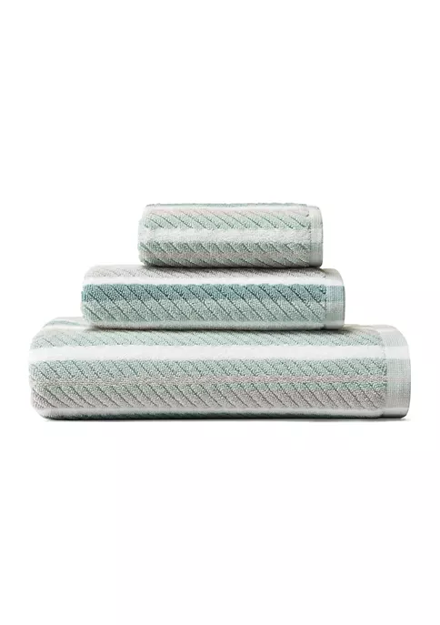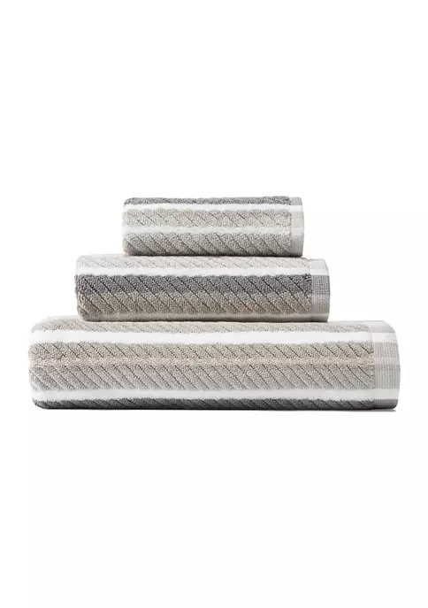 Plush and ultra-soft, the Tommy Bahama® Ocean Bay Stripe three-piece towel set is a welcome addition to any bathroom. Made of absorbent cotton, this set includes the essentials to any bathroom needs, including a bath, hand and wash towel. These two-ply combed towels are machine washable for easy care and the set is available in both a gorgeous blue and grey colorway that is sure to coordinate with any bathroom décor.
