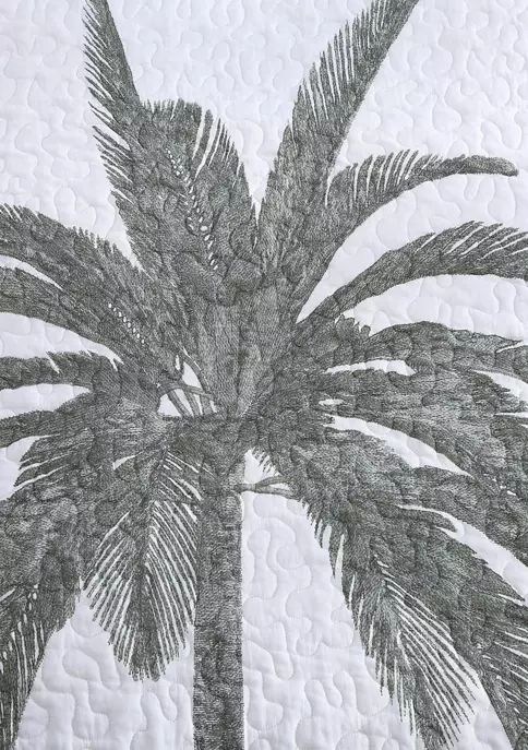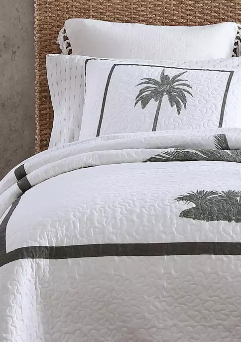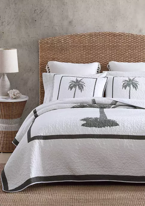 Our Tommy Bahama Palm Island quilt was inspired by the tropical islands of Hawaii. Our Tommy Bahama Palm Island quilt features an engineered embroidered palm motif in a beautiful green on a white ground, reversing to a solid white. This quilt is 100% cotton, with a cotton (80%)/polyester (20%) filling, lightweight and easy to layer. This quilt is fully reversible for multiple styling options. Your quilt set will arrive secured with a ribbon and we have reduced our packaging, eliminating all plastic. Quilt and shams are sold separately. Machine washable, for easy care. Full/Queen includes 1 quilt; King includes 1 quilt. Full/queen set: Quilt- 90”L x 90”W, King set: Quilt-96”L x 104”W,