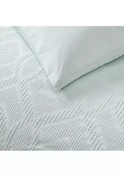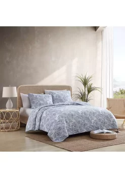 Create a personal island retreat at home with the Serenity Palms Quilt by Tommy Bahama®. The main print features a relaxing oasis of beautifully rendered palm trees in salt-washed tones of aquamarine and teal with leaf green accents, scattered across a bleached ivory ground.