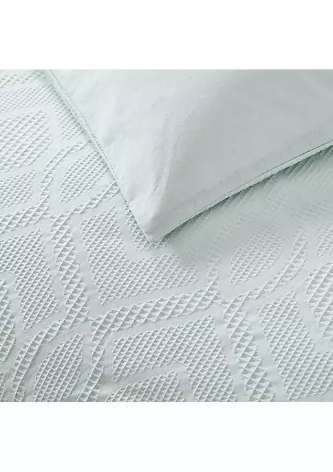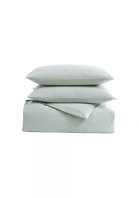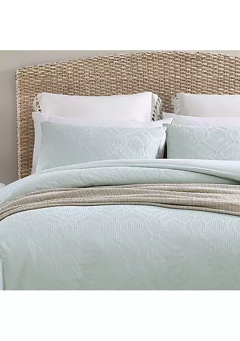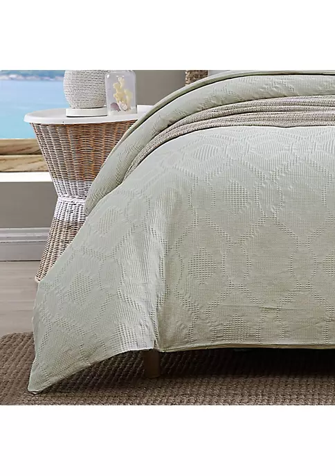 Transform your bedroom into a serene oasis with the Tommy Bahama textured waffle comforter set. This comforter set features a unique and subtle geo textured design on a solid ground. The reverse is a matching solid ground on a cotton percale. The comforter is 100% cotton with an 8 oz. Polyester fill. Our products are crafted with you in mind, this comforter set is standard 100 by oeko-tex certification- tested against a list of 350 harmful substances, resulting in a chemical free item. The set includes 1 comforter and 2 shams. Ensemble is machine washable for easy care.