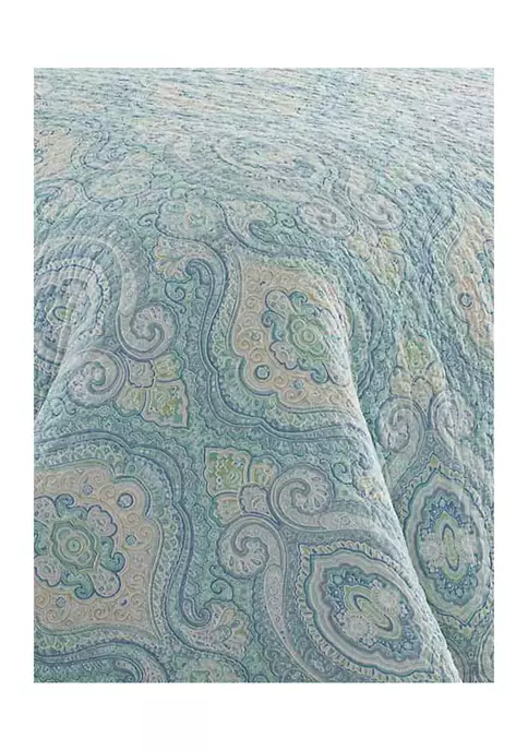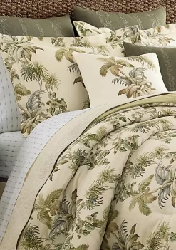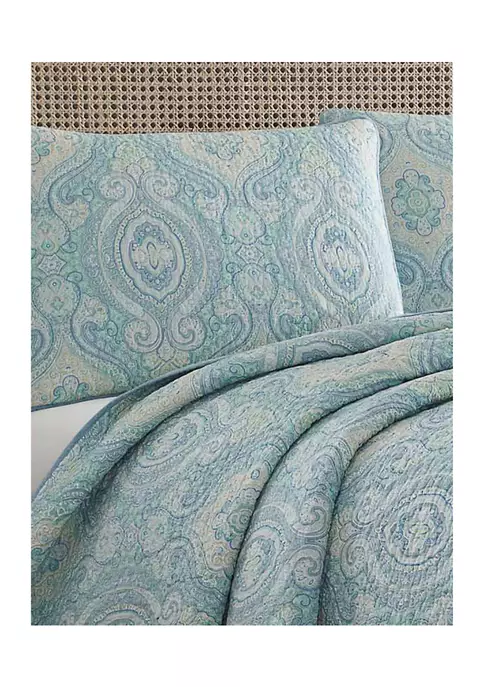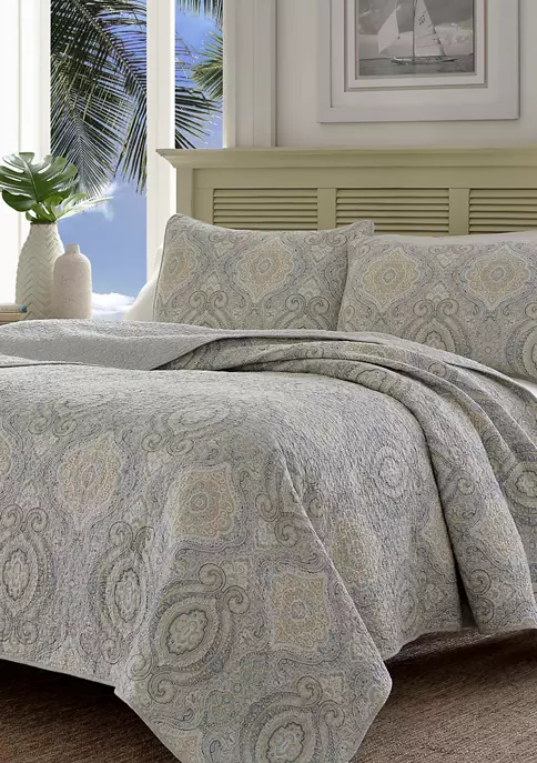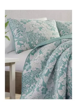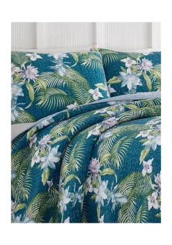 Our Tommy Bahama Turtle Cove quilt in aqua is inspired by a tropical vacation. The Tommy Bahama Turtle Cove quilt in aqua features a aqua and blue patterned design printed on a aqua ground with a solid aqua reverse. This quilt is 100% cotton, with a cotton (80%)/polyester (20%) filling, lightweight and easy to layer. The shams feature a two piece back closure. The corners of the quilt are rounded to match the sham, both edges are finished with a fabric binding. This quilt set is fully reversible. We have reduced our packaging, eliminating all plastic. Your quilt set will arrive secured with a ribbon. The set includes 1 quilt and 2 shams (1 sham for the twin set). Machine washable, for easy care. Twin set: Quilt- 88”L x 68”W, Standard Sham 21″L x 27”W; Full/queen set: Quilt- 90”L x 90”W, Standard Shams- 21”L x 27”W; King set: Quilt-96”L x 104”W, King Shams- 21”L x 37”W.