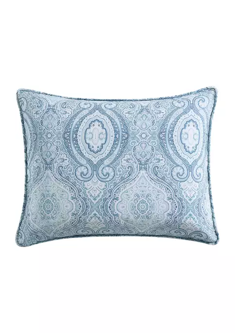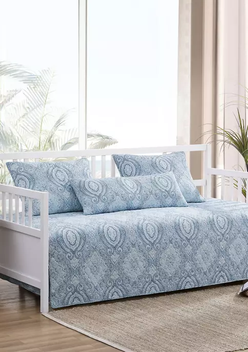 Add a touch of classic tropical décor to your guest room with Tommy Bahama turtle cove daybed cover set. This signature print features a multi blue and ivory geometric medallion print on a light blue ground. This daybed is 100% cotton, with a cotton (80%)/polyester (20%) filling, lightweight and easy to care for. The corners of the daybed are rounded to match the shams, both edges are finished with a fabric binding. Our products are crafted with you in mind, this daybed set is standard 100 by oeko-tex certification- tested against a list of 350 harmful substances, resulting in a chemical free item. This convenient set includes 1 daybed, 2 shams and 1 breakfast decorative pillow cover. Machine washable, for easy care